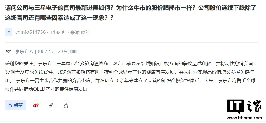结合IT之家上月报道,三星在不久前与京东方在显示领域知识产权方面达成和解,并将尽快撤销美国 337 调查及其他关联案件。