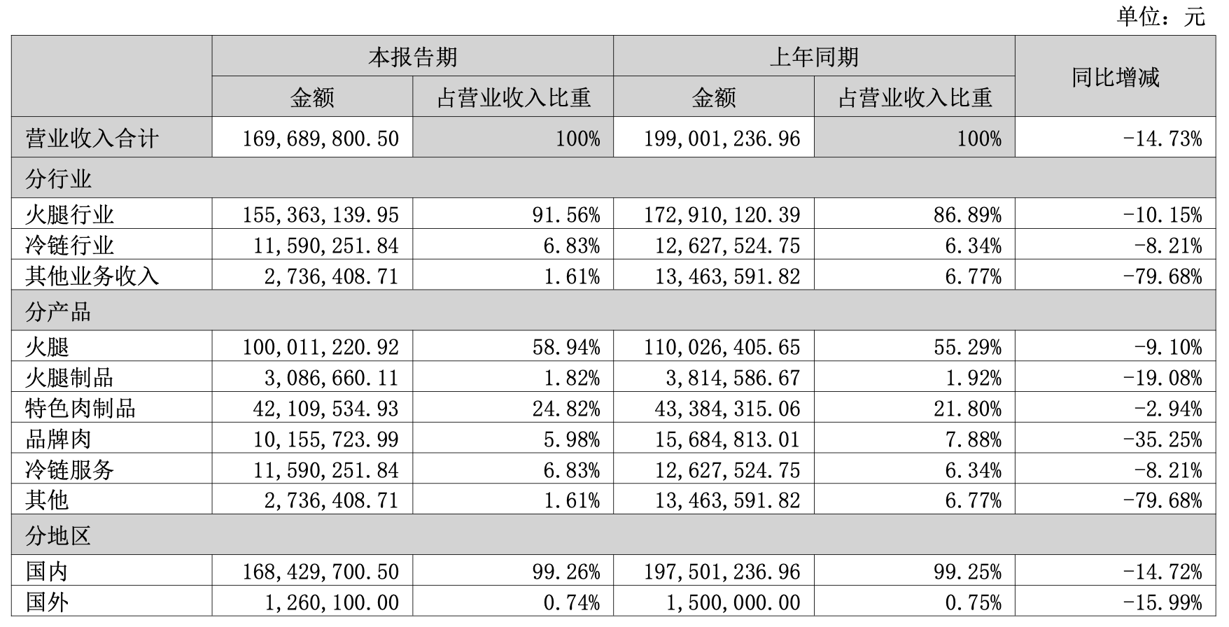 其中,火腿业务是绝对支柱业务,上半年,该业务营收1亿元,贡献近6成营收,销售量同比下降14.00%至100.46万公斤。
