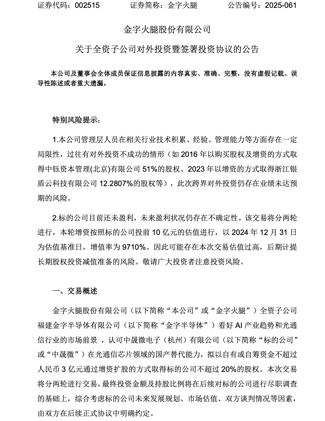 公告显示,本轮增资按照标的公司投前10亿元的估值进行,以2024年12月31日为估值基准日,增值率为9710%。
