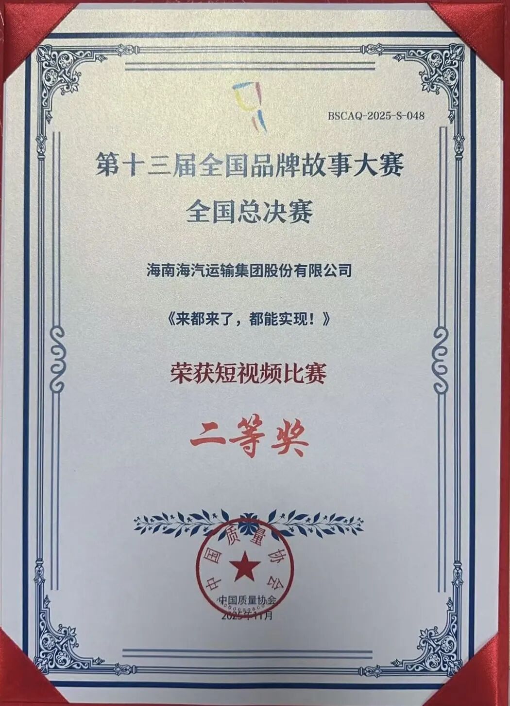 11月21日,由中国质量协会主办的第十三届全国品牌故事大赛全国总决赛圆满落幕。海汽集团(603069)两部作品从全国众多参赛作品中脱颖而出,斩获佳绩:短视频作品《来都来了,都能实现》荣获二等奖;《无忧出行 新体验》荣获三等奖,尽显品牌实力。