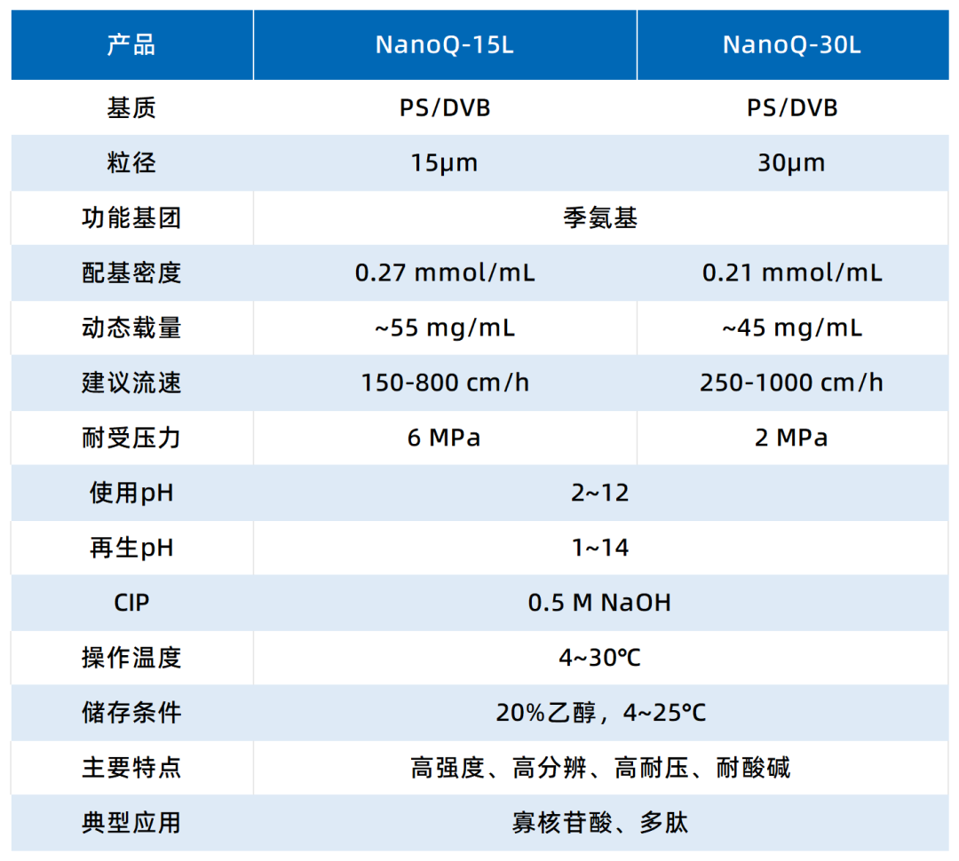 纳微科技NanoQ系列强阴离子介质性能优异,采用机械强度出众的PS/DVB作为基质,该基质经表面亲水改性后键合离子交换基团,既具备良好的生物相容性,又拥有稳定的物化特性,可显著提升分离纯化效率。NanoQ系列介质可提供10μm、15μm、30μm多种粒径选择,且兼容高压DAC装填工艺。其中,高分辨率的NanoQ-15L与NanoQ-30L尤其适用于寡核苷酸样品的纯化,是寡核苷酸下游纯化的理想介质选择。