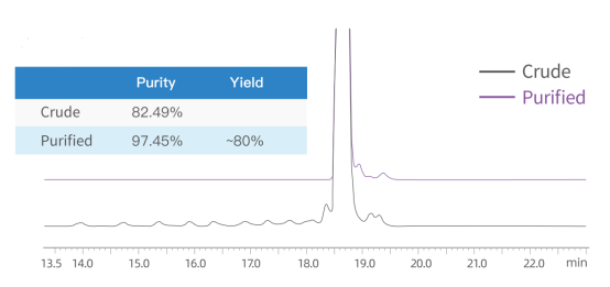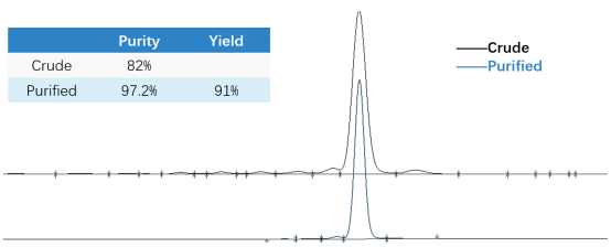 采用NanoQ-30L纯化寡核苷酸,通过 HPLC对纯化前后样品进行分析。结果显示,粗品纯度约82%(图9黑色),其中含有工艺相关杂质、片段异构体等,经过纯化后,样品纯度得到突破性提升,最终达到97.2%(图9蓝色),关键杂质得到有效去除,满足质控标准。同时,收率保持在90%以上,实现了纯度和收率的兼顾。
