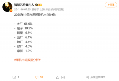 博主“智慧芯片案内人”近日披露的2025年国内折叠屏手机出货数据显示,华为在该领域继续保持着压倒性的优势地位。据统计,华为以66.6%的出货份额稳居国内市场第一,其市场份额几