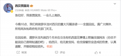 1月16日,西贝餐饮创始人贾国龙通过微博发声,正式向罗永浩“宣战”。贾国龙表示,针对罗永浩近期对西贝造成的重大污蔑和诽谤,他将在今晚10点进行一一回应,并呼吁广大媒体、