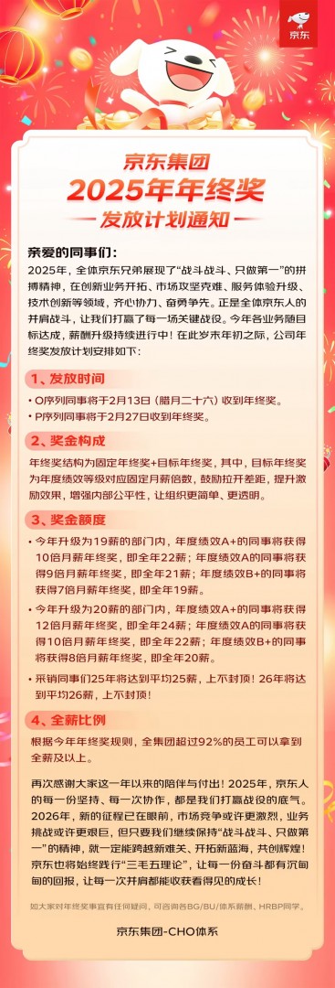 12月25日消息,京东今天又发布了2025年终奖公告,京东全集团92%的员工拿满甚至拿到超额年终奖,年终奖总投入同比增幅超过70%,预计将创下行业今年最大涨幅。据了解,京东去年9月发布了20薪升级计划,宣布自2024年10月1日起京东零售集团和职能体系将用两年时间实现20薪,其他部门也将随后陆续启动加薪。根据该加薪计划,今年京东年终奖继续大幅上涨,已升级部门今年实现19薪,同时更有业务单元提前实现20薪。此外,一线员工年终奖仍将在年前发放。