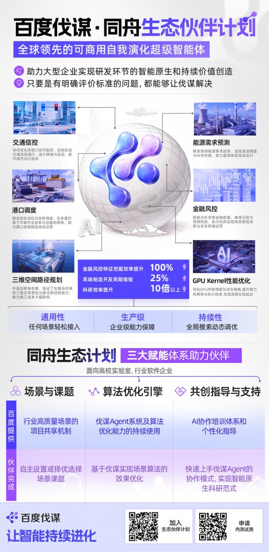 同时,为了进一步加速AI在千行百业的渗透,让顶尖算法工程师将成为企业和科研标配,百度伐谋正式发布“同舟生态伙伴计划”,面向高校实验室、行业软件企业,开放高质量行业场景与课题,共享伐谋Agent系统及算法优化引擎,并提供AI协作培训与个性化服务指导。对于高质量伙伴的科研创新或产业实践项目,百度伐谋将提供全面免费支持。(果青)