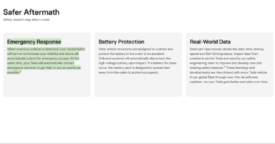 而且,特斯拉上周刚刚更新了网站上的安全页面。“当你在特斯拉车内并检测到严重碰撞时,你的危险警示灯会自动打开,你的车门会自动解锁,在某些地区,你的车辆会自动拨打911并向接线员传递信息以便紧急服务尽快到达。“