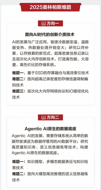 研究方向聚焦两大前沿领域:一是“面向AI时代的创新介质技术”,探索超高密度信息记录和层次化大内存技术,通过“以存补算、以存换算”提升计算效率;二是“Agentic AI原生的数据底座”,构建“数据存管用”一体化平台,突破知识提取、多模态表征等关键技术。