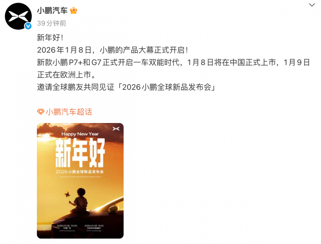 小鹏官宣新款 P7+、G7定档1月8日