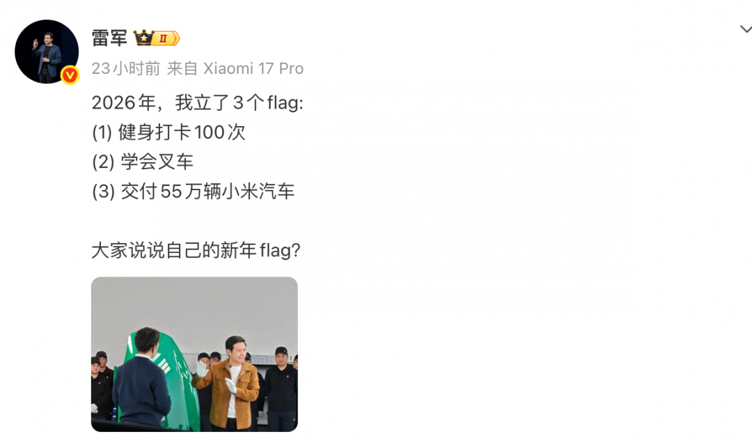 昨日,雷军宣布2026年立3个Flag:健身打卡100次、学会叉车、交付55万辆小米汽车。