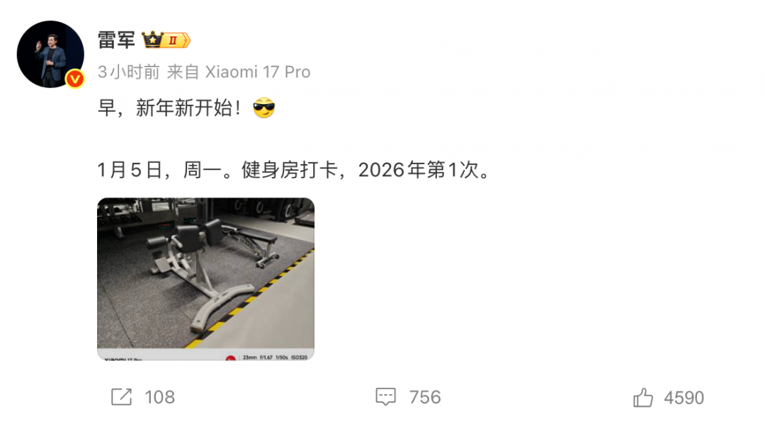1月5日消息,今日早间,雷军在社交平台晒出健身房打卡照,称新年新开始,健身房打卡,2026年第1次。