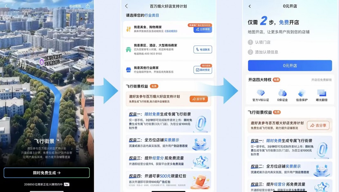 昨日,高德发布全面升级的高德扫街榜,并启动“百万烟火好店支持计划”,宣布将投入价值数亿元的算力资源,为100万商家免费接入“飞行街景”。