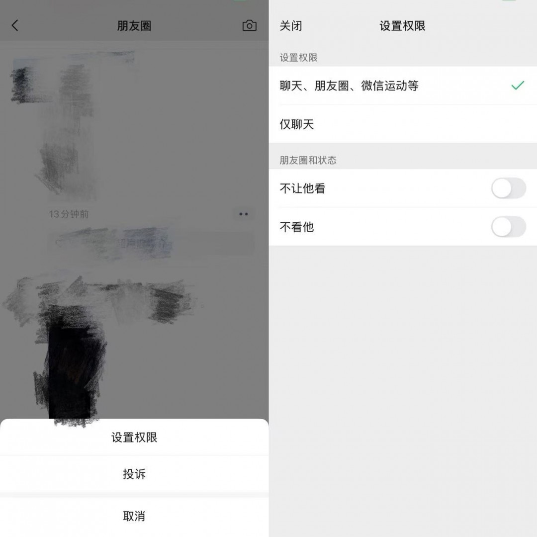 据了解,在刷朋友圈时,长按他人微信头像,可以直接设置朋友权限。在该页面,你可以设置“仅聊天”或选择不让他看/不看他的朋友圈和状态。