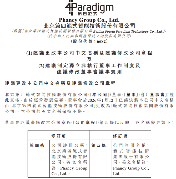 此前,第四范式董事会已于2025年12月1日已议决将公司英文名称由“Beijing Fourth Paradigm Technology Co., Ltd.”更改为“Phancy Group Co., Ltd.”。