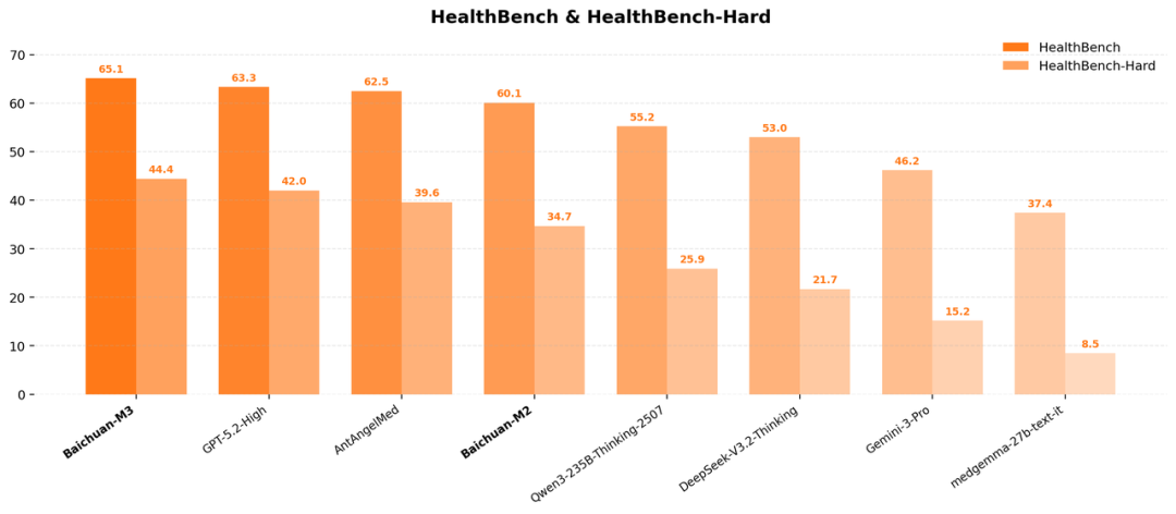 2025年8月,百川开源医疗增强大模型 M2 在 HealthBench 上力压 gpt-oss-120B、DeepSeek-R1 等同期所有开源模型,并在 HealthBench Hard 上取得 34.7 分的成绩,仅次于GPT-5,成为全球唯二突破 32 分的模型。
