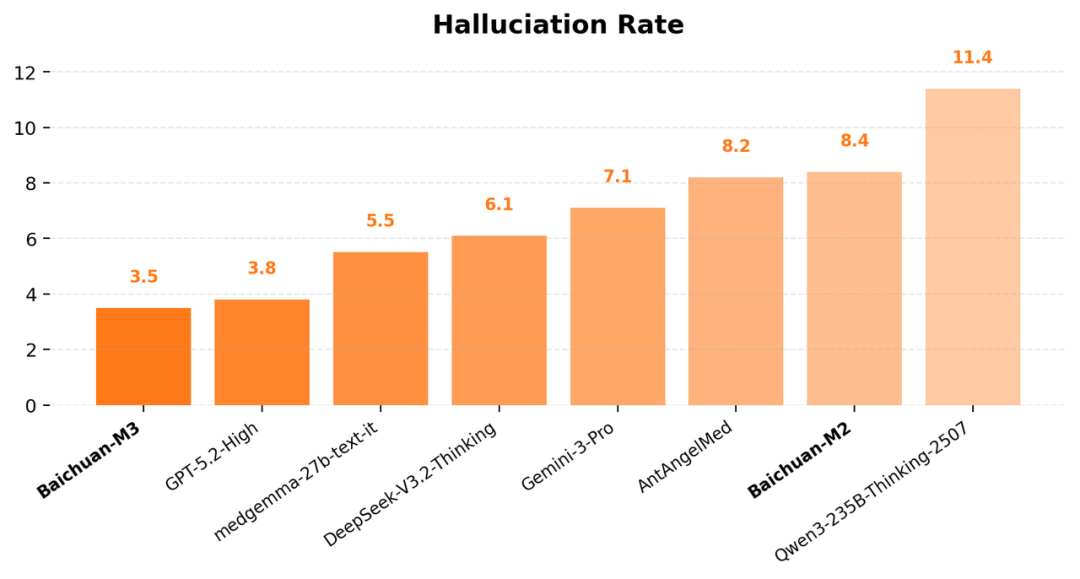 百川M3将医疗幻觉抑制前移至模型训练阶段,在强化学习过程中将医学事实一致性作为核心训练目标之一,将“知之为知之,不知为不知”直接作用于模型自身能力的形成过程。这一新的训练方法将医学事实可靠性内化为M3自身的基础能力,使其在不借助任何外部系统的情况下,依然能够基于自身医学知识进行稳定、可信的作答。通过将事实一致性约束融入训练流程,M3重构了幻觉抑制的训练范式,在不依赖工具或检索增强的纯模型设置下,医疗幻觉率3.5,超越GPT-5.2,达到全球最低水平。