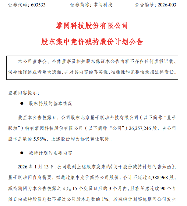 掌阅科技股东量子跃动计划减持不超过1%股份