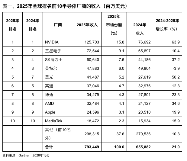 Gartner:2025年全球半导体厂商TOP10中仅英特尔收入下降