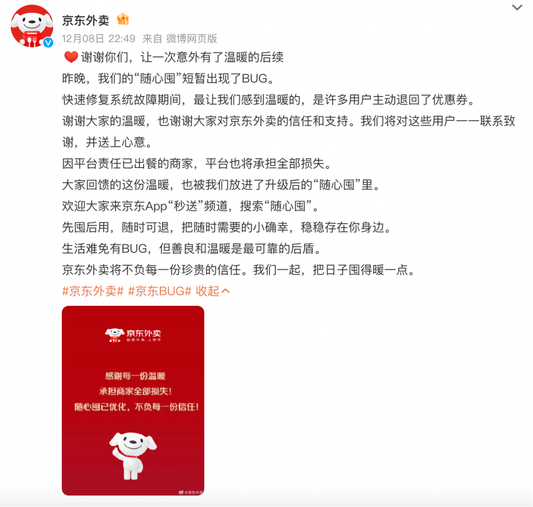 谢谢你们,让一次意外有了温暖的后续昨晚,我们的“随心囤”短暂出现了BUG。快速修复系统故障期间,最让我们感到温暖的,是许多用户主动退回了优惠券。谢谢大家的温暖,也谢谢大家对京东外卖的信任和支持。我们将对这些用户一一联系致谢,并送上心意。