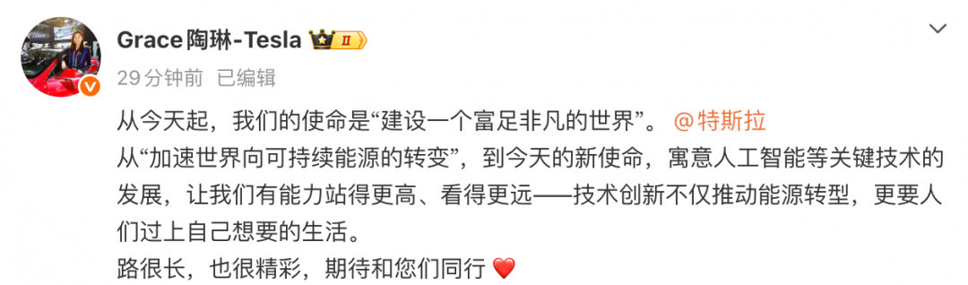 特斯拉副总裁陶琳发文:从今天起,特斯拉的使命是“建设一个富足非凡的世界”。