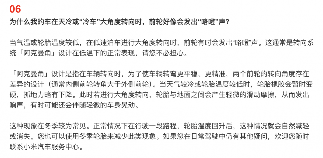 小米汽车表示,“当气温或轮胎温度较低,在低速泊车进行大角度转向时,前轮有时会发出“咯噔”声。这通常是转向系统「阿克曼角」设计在低温下的正常表现,请您不必担心。