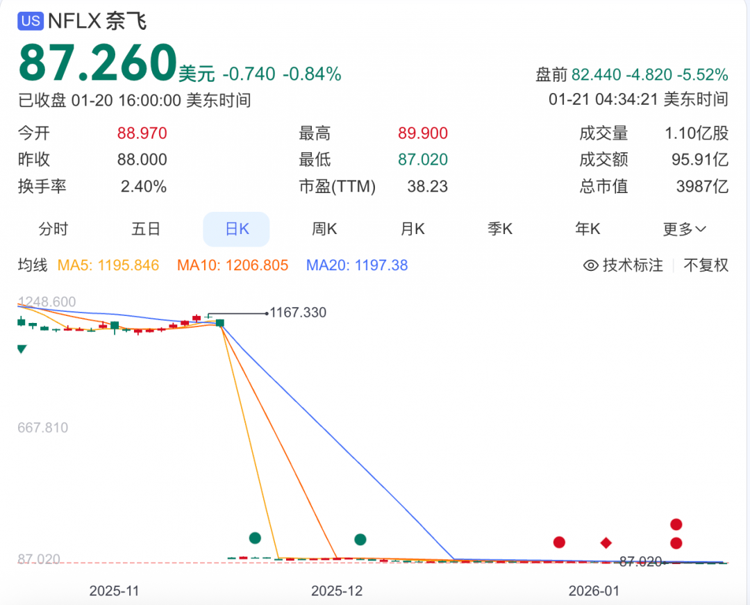 为收购华纳兄弟探索暂停股票回购 奈飞盘后跌逾5%