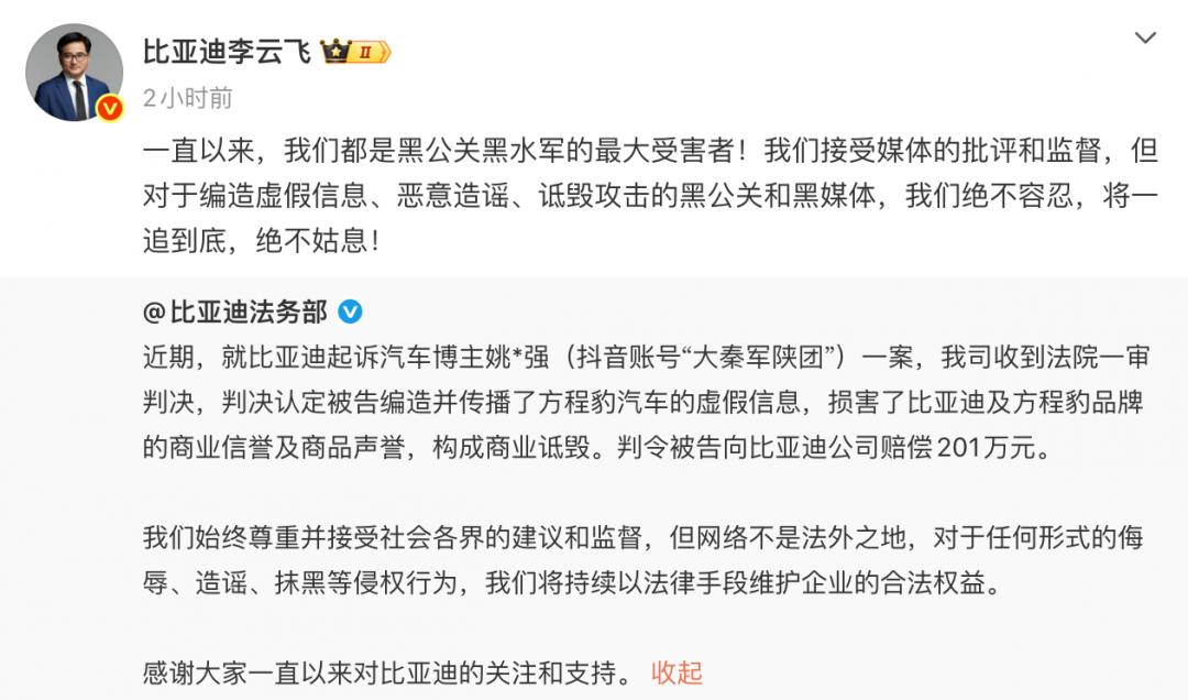 比亚迪集团-品牌及公关处总经理李云飞转发了比亚迪法务部的公告表示:“一直以来,我们都是黑公关黑水军的最大受害者!我们接受媒体的批评和监督,但对于编造虚假信息、恶意造谣、诋毁攻击的黑公关和黑媒体,我们绝不容忍,将一追到底,绝不姑息!”