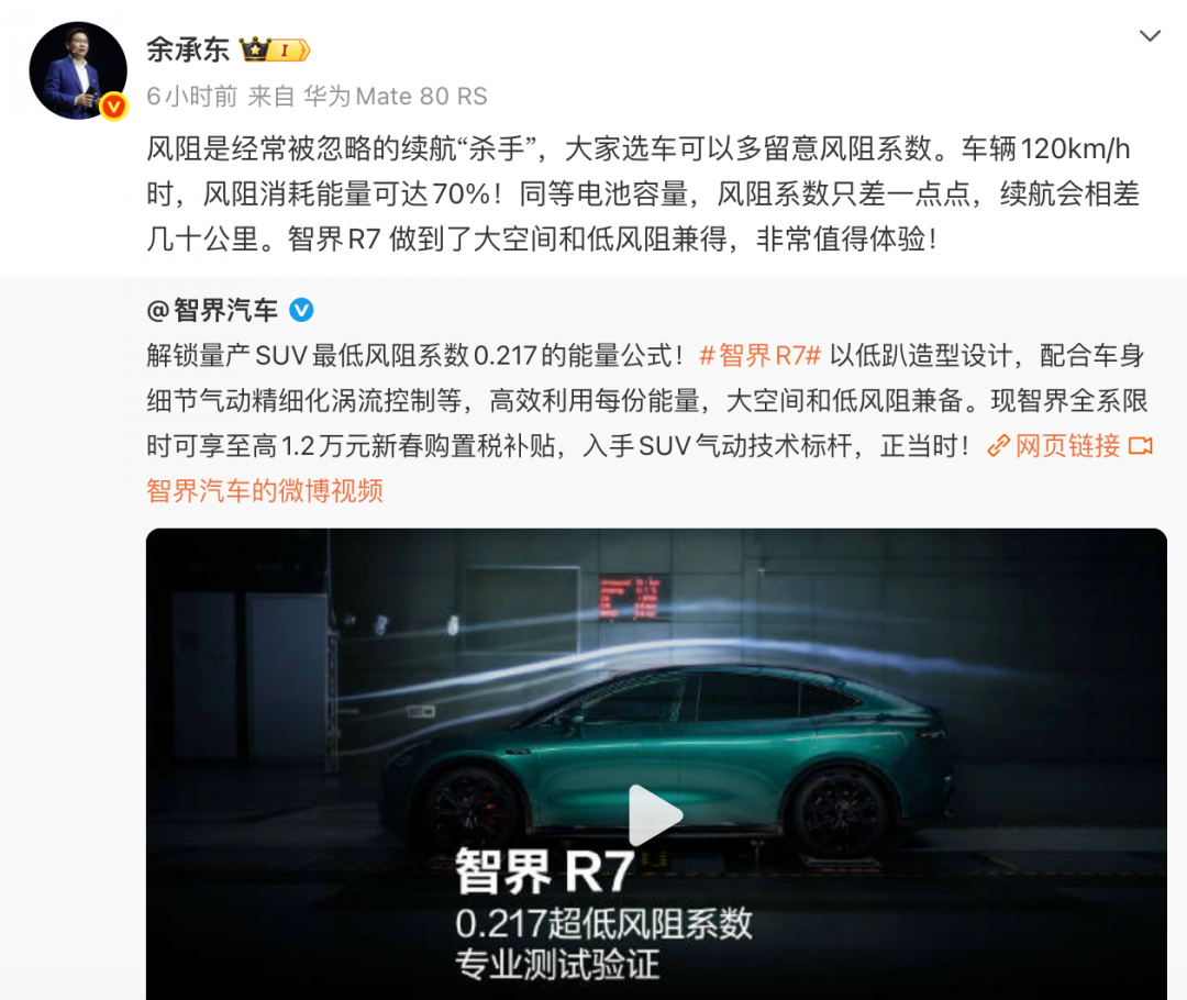 华为常务董事、产品投资评审委员会主任、终端 BG 董事长也发文谈及了汽车风阻,称其是经常被忽略的续航“杀手”。余承东重申,车辆 120km/h 时,风阻消耗能量可达 70%!同等电池容量,风阻系数只差一点点,续航会相差几十公里。