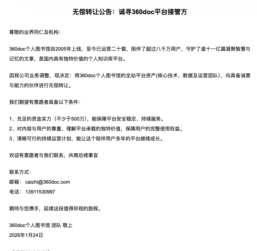 360doc个人图书馆表示“自2005年上线,至今已运营二十载,陪伴了超过八千万用户,守护了逾十一亿篇凝聚智慧与记忆的文章”。因公司业务调整,现决定:将360doc个人图书馆的全站平台资产(核心技术、数据及运营团队),向具备诚意与能力的伙伴进行无偿转让。