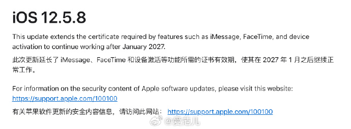 根据苹果的更新发布说明,iOS 12.5.8扩展了iMessage、FaceTime和设备激活等功能的证书要求,这些功能将在2027年1月后继续有效。