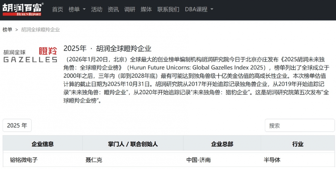 1月29日消息,近日,胡润研究院发布《2025胡润未来独角兽:全球瞪羚企业榜》,镕铭微电子(济南)有限公司(以下简称“镕铭微电子”)继2024年入选该榜单后,再度获评。