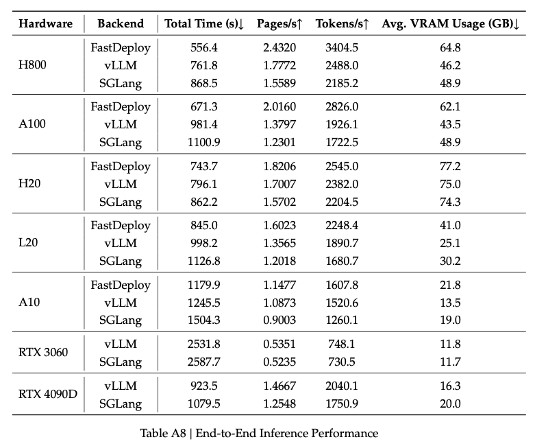 另外,在硬件适配方面,PaddleOCR-VL-1.5模型在H800、A100、RTX 4090D等多种硬件上均具备的高效推理性能,验证了其广泛的部署适用性。PaddleOCR-VL-1.5具备优秀的工程化和部署友好性,能够灵活适配从数据中心到边缘设备的各种计算环境,为其大规模实际应用奠定了坚实的基础。