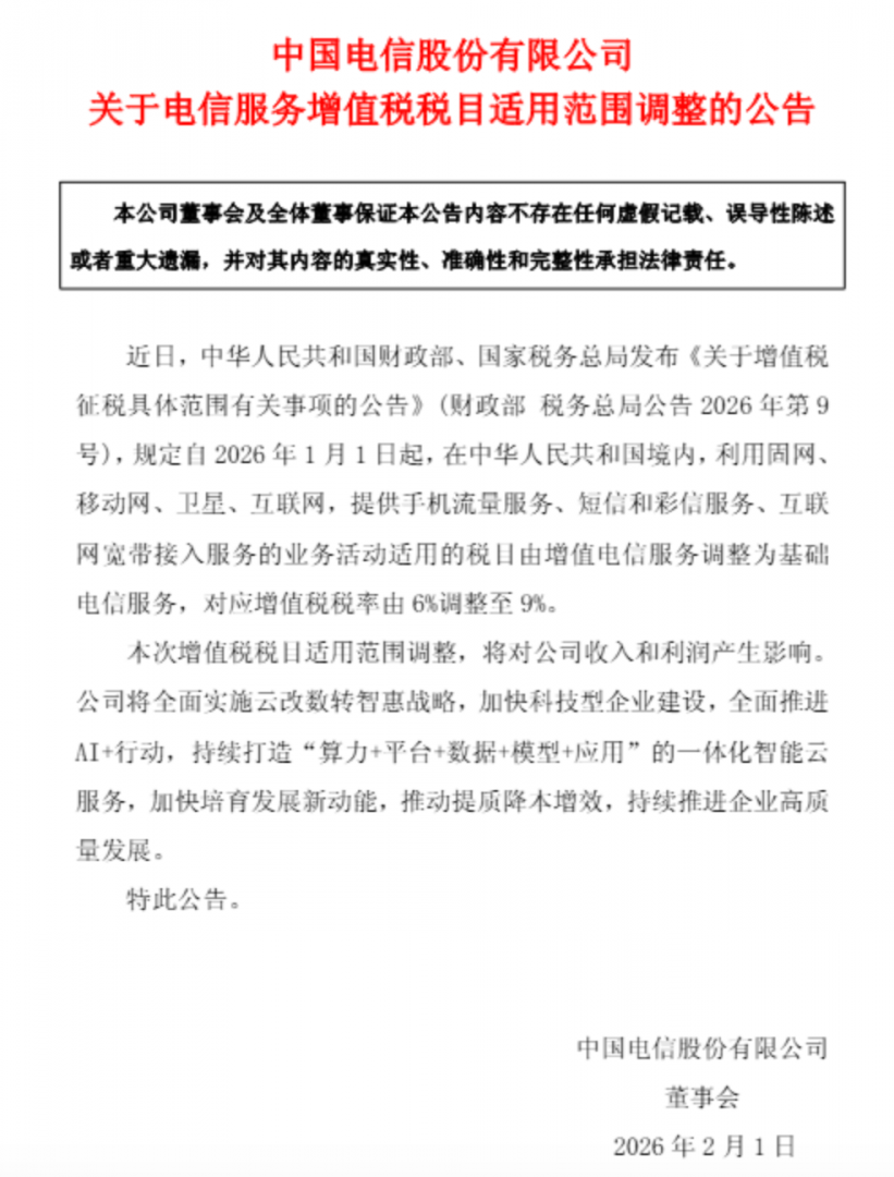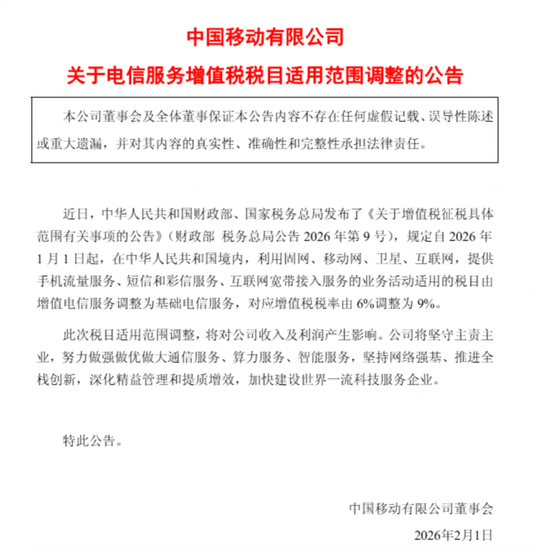 2月2日消息,日前,中国移动、中国电信及中国联通三大电信运营商相继发布公告表示,调整电信服务增值税税率。
