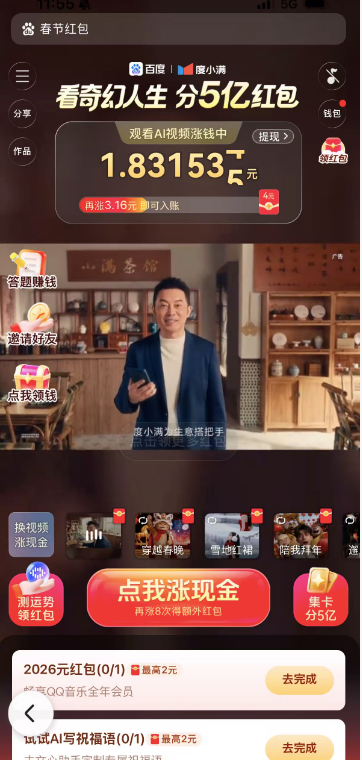 百度红包的三种核心玩法包括:看视频领钱、前1000名集齐稀有卡得万元,以及通过文心助手猜口令。截至2月1日,已有近5000万人次使用AI功能抢红包,其中拍照搜万物和AIGC视频创作最受欢迎。