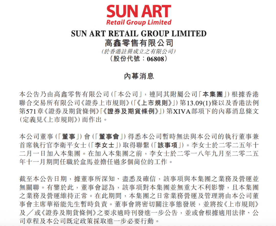 在最新公告中,高鑫零售确认,暂时无法与公司执行董事兼CEO李卫平取得联系。并表示,该事项与本集团业务及营运并无关联。