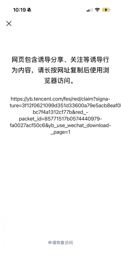 页面提示:“网页包含诱导分享、关注等诱导行为内容,请长按网址复制后使用浏览器访问。”