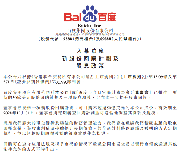 2月5日消息,百度集团发布公告,公司董事会宣布批准一项新的股份回购计划及首次股息政策,旨在持续提升股东回报。