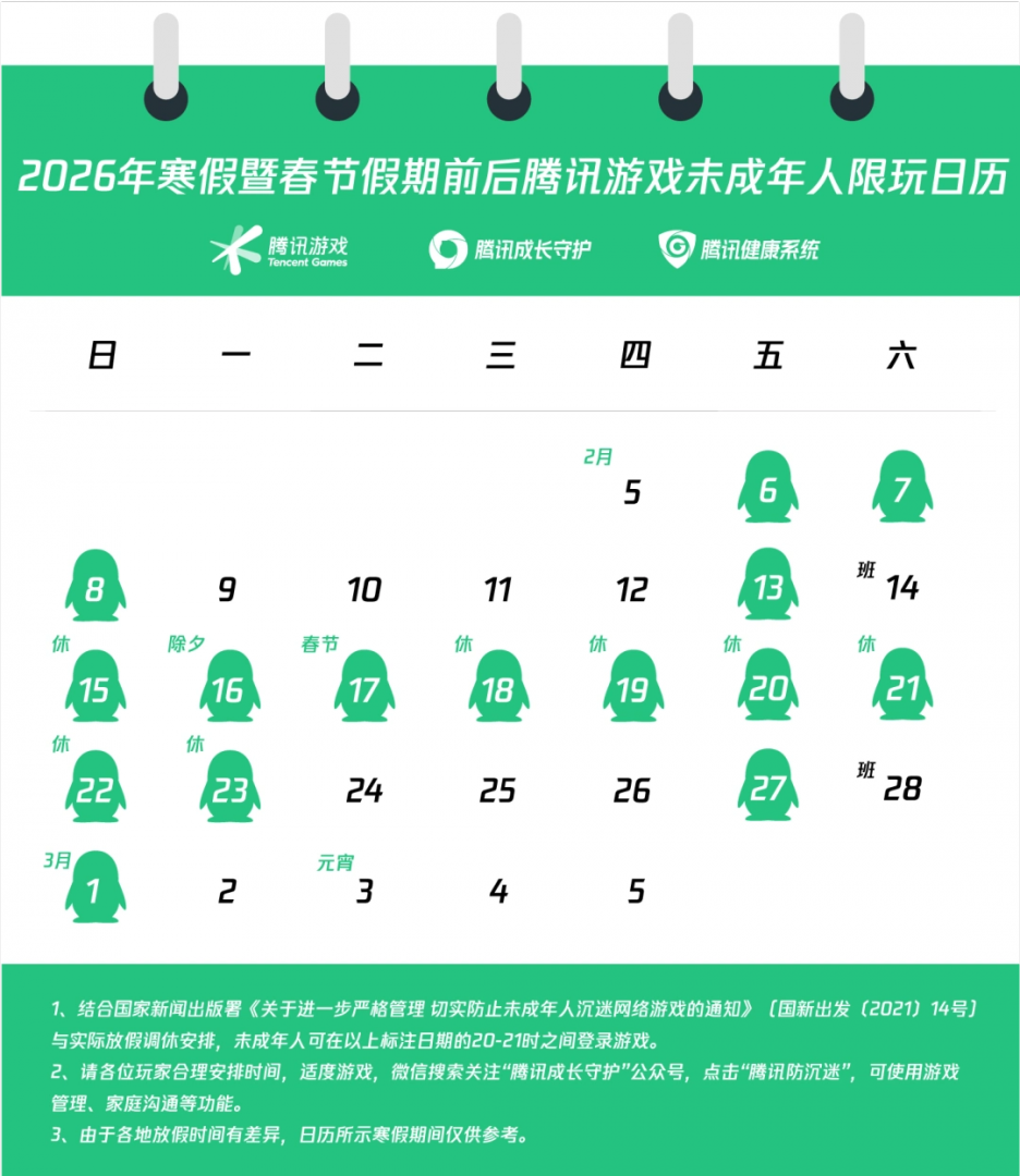 2026年寒假未成年人游戏限玩日历来了:最多可玩15个小时