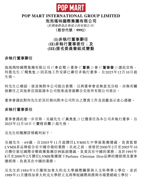 12月11日消息,泡泡玛特10日发布公告,宣布LVMH大中华区总裁吴越正式加入公司董事会,担任非执行董事。