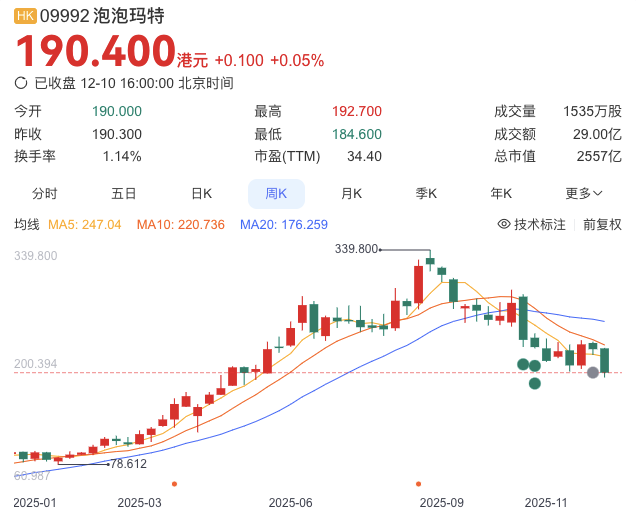 随着旗下IP LABUBU全球大火,泡泡玛特2025年第三季度收入同比增长245%至250%,海外市场增速尤为显著,公司毛利率高达70.3%,接近爱马仕水平。公司股价在今年8月一度飙升至330港元,不过随后下滑,昨日收盘股价报190.4港元/股。