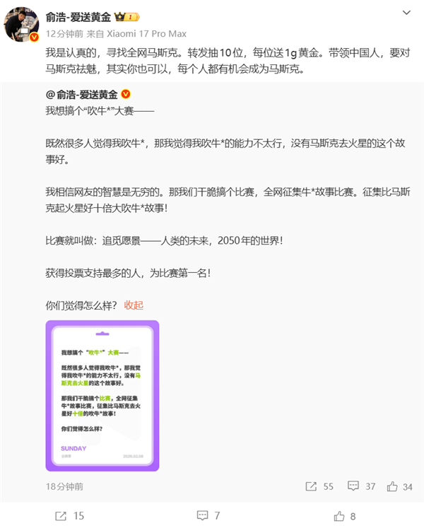 俞浩在微博中表示,既然外界经常评价他爱“吹牛”,但他自认这方面的能力远不如马斯克,毕竟后者绘制的“去火星”蓝图听起来宏大得多。为了挖掘民间的智慧,他决定顺势而为,发起一场名为“追觅愿景——人类的未来,2050年的世界!”的创意征集大赛。他喊话全网,征集比“移民火星”还要精彩十倍的“吹牛”故事,并承诺获得投票支持最高的参与者将夺冠。此外,为了寻找“全网马斯克”,俞浩还宣布转发抽奖活动,送出10克黄金,旨在激励大众打破迷信,认识到每个人都有机会成为改变世界的马斯克。