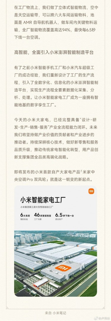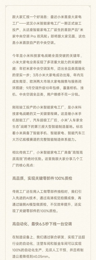 卢伟冰称,今年小米大家电完成了全品类高端化、成功出海、空调升级十年免费包修的多项能力跨越,首款自产中央空调的发布将是小米大家电的又一新起点。