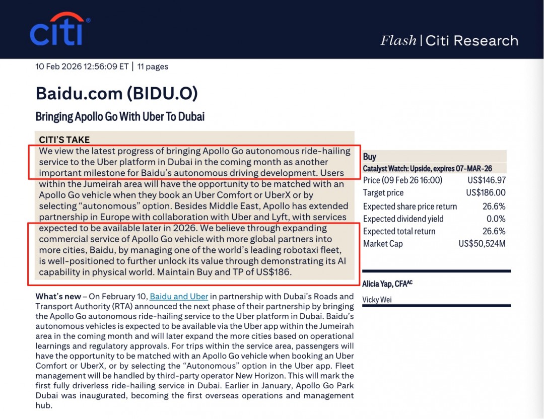 与此同时,2月10日,百度旗下无人驾驶平台萝卜快跑宣布即将于迪拜开展全无人商业化运营后,花旗银行重申对百度的"买入"评级。花旗指出,萝卜快跑即将在迪拜开展全无人商业化运营,是百度自动驾驶发展的重要里程碑。通过与全球合作伙伴扩大商业服务范围,百度凭借领先的自动驾驶车队规模,正在现实场景中持续验证并释放其人工智能价值。