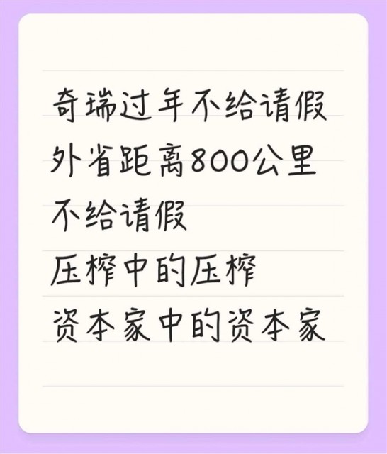 春节返乡遇“拦路虎”?奇瑞汽车被曝严控请假,员工吐槽“省外仅批一天”