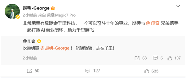 荣耀前掌舵人赵明官宣加盟千里科技,携手印奇共筑AI商业闭环