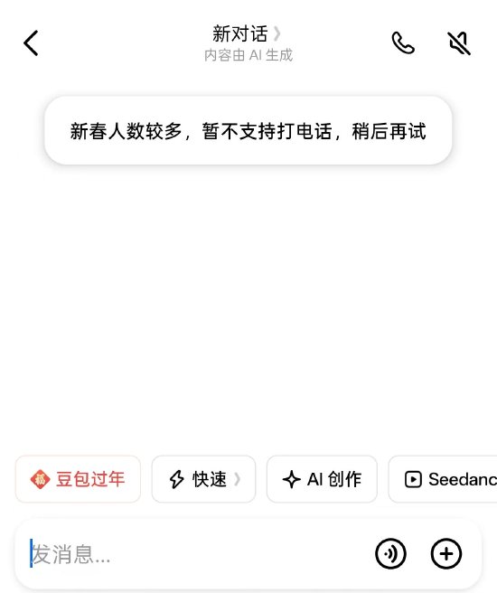 新浪科技讯 2月16日下午消息,今日,新浪科技实测发现,豆包App目前暂停了视频通话功能,页面显示“新春人数较多,暂不支持此功能”,或因算力压力所致。
