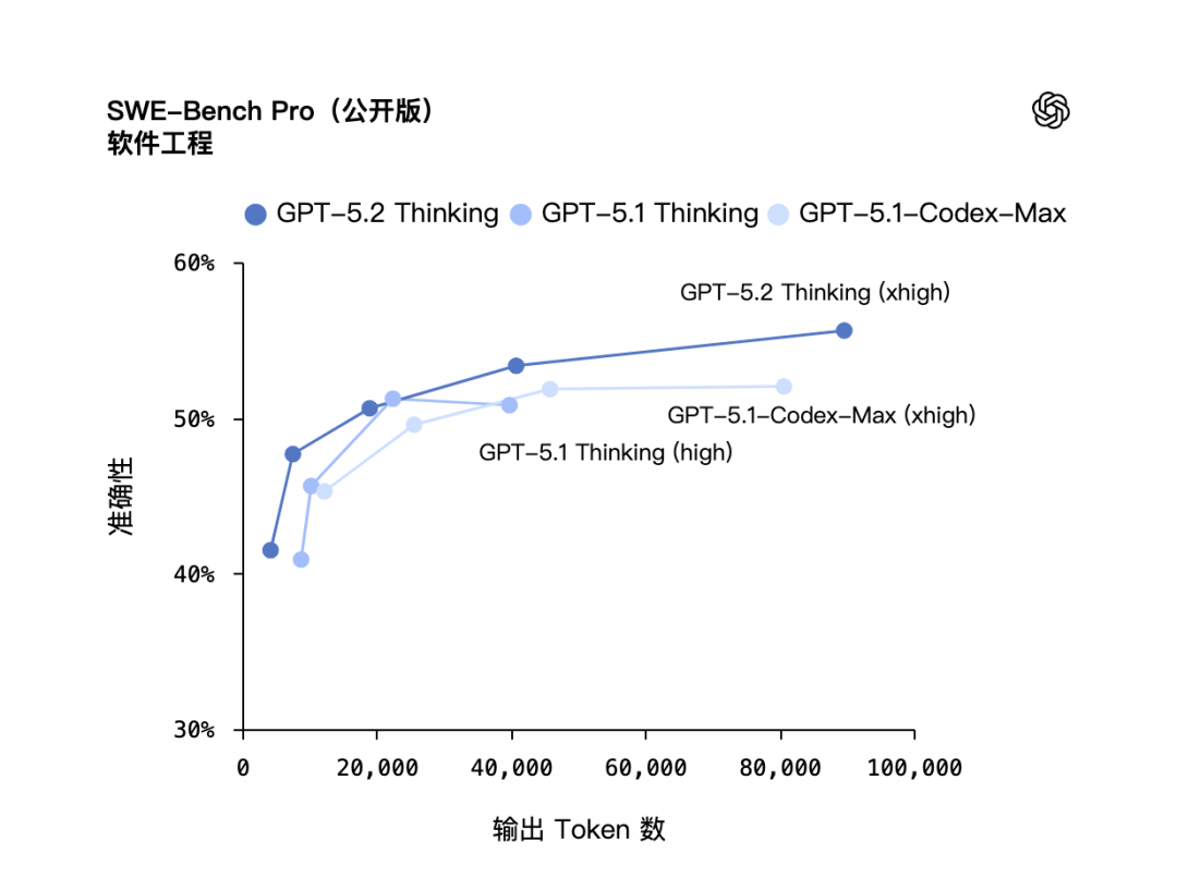 在对延迟敏感的场景中,GPT‑5.2 Thinking 在 reasoning.effort=‘none’ 模式下也有显著提升,性能大幅领先 GPT‑5.1 和 GPT‑4.1。