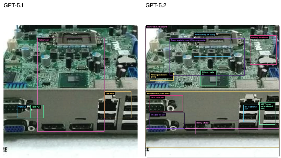 GPT‑5.2 Thinking是OpenAI目前最强的视觉模型,在图表推理和软件界面理解方面将错误率大幅降低,约减少了一半。