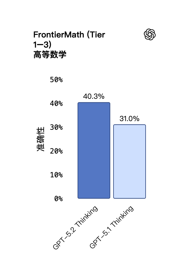 在专家级数学评测 FrontierMath (Tier 1–3)中,GPT‑5.2 Thinking 树立了新的技术标杆,解决了40.3%的问题。