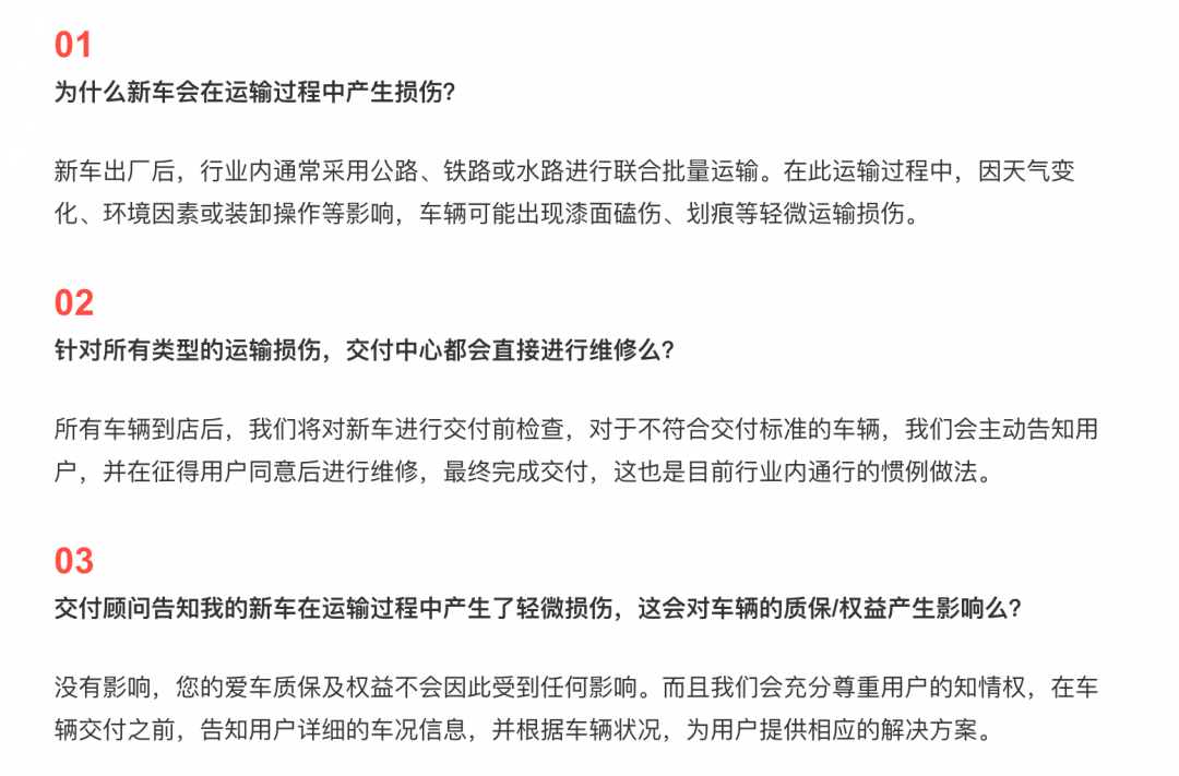 小米汽车表示,新车出厂后,行业内通常采用公路、铁路或水路进行联合批量运输。在此运输过程中,因天气变化、环境因素或装卸操作等影响,车辆可能出现漆面磕伤、划痕等轻微运输损伤。